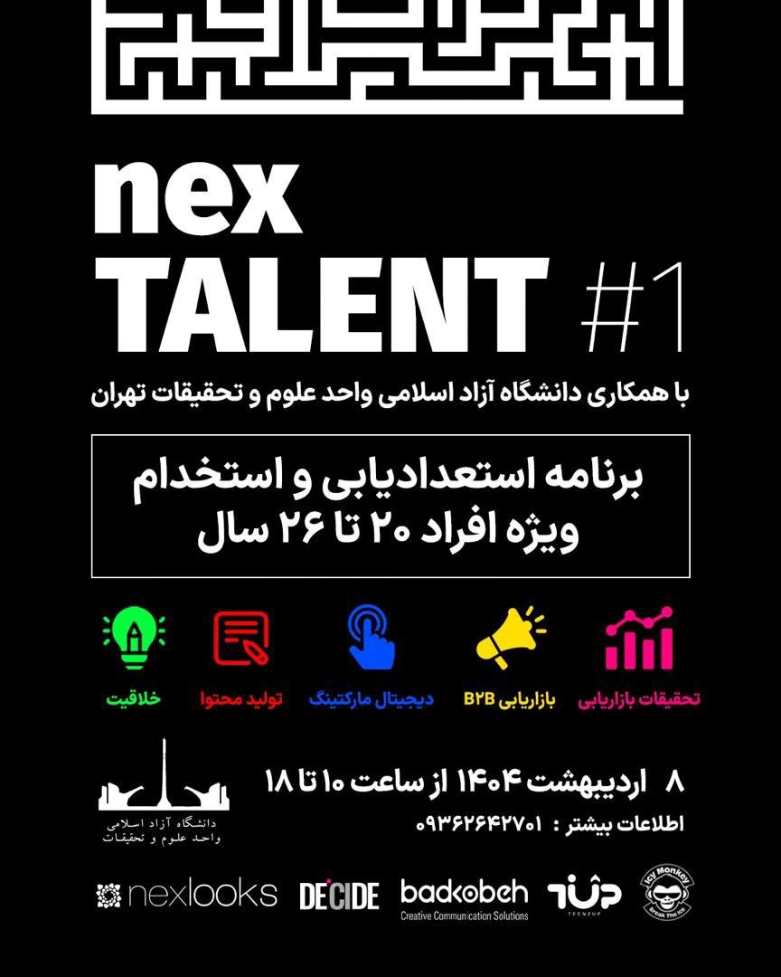 کارگاه استعدادیابی nexTalent و استخدام ویژه افراد 20 تا 26 سال به همت دانشگاه آزاد اسلامی واحد علوم و تحقیقات تهران با همکاری تیتزآپ و حمایت تعدادی از آژانسهای تبلیغاتی و بازاریابی روز 8 اردیبهشت برگزار میشود.