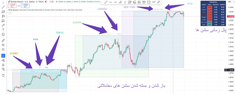 اندیکاتور سشن فارکس معرفی‌شده توسط سایت تریدینگ فایندر با قابلیت‌هایی مانند: