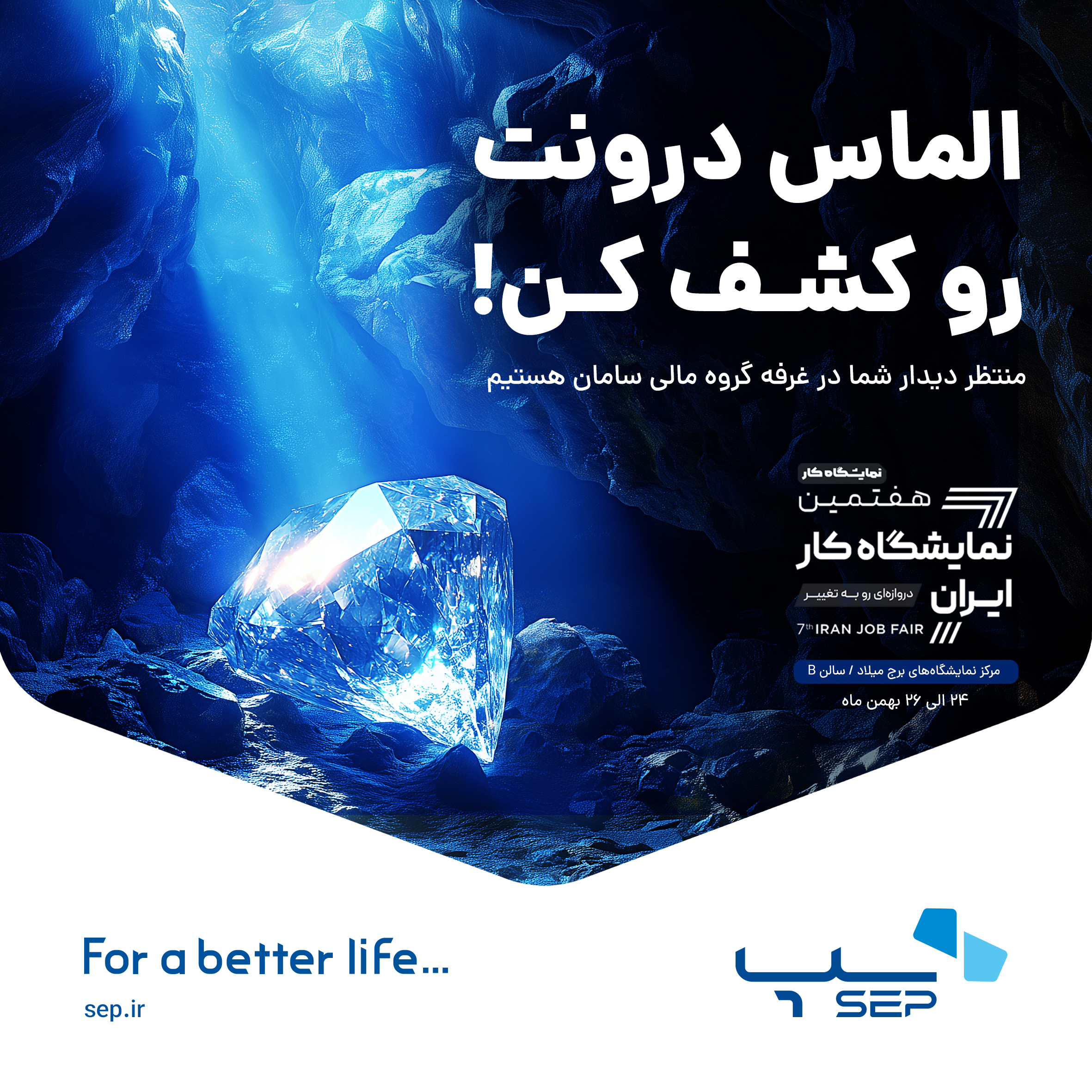 پرداخت الکترونیک سامان (سپ) در هفتمین نمایشگاه کار ایران حضور دارد. این مجموعه با شعار «الماس درونت را کشف کن» از 24 تا 26 بهمن ماه میزبان علاقهمندان است.