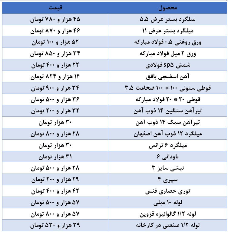در جدول زیر، قیمت روز برخی از محصولات بازار آهن و فولاد قابل مشاهده است؛