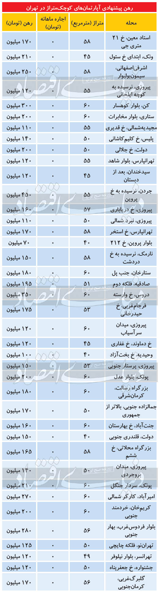 قیمت رهن برخی خانه ها را در جدول زیر مشاهده می کنید.