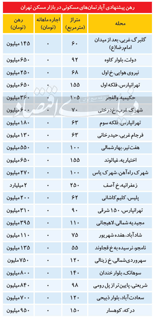با این توضیح نگاهی داریم به گزارش دنیای اقتصاد درباره وضعیت بازار رهن آپارتمان در تهران و ارزان ترین آپارتمان های رهن کامل را بر اساس گزارش این روزنامه مرور می کنیم.