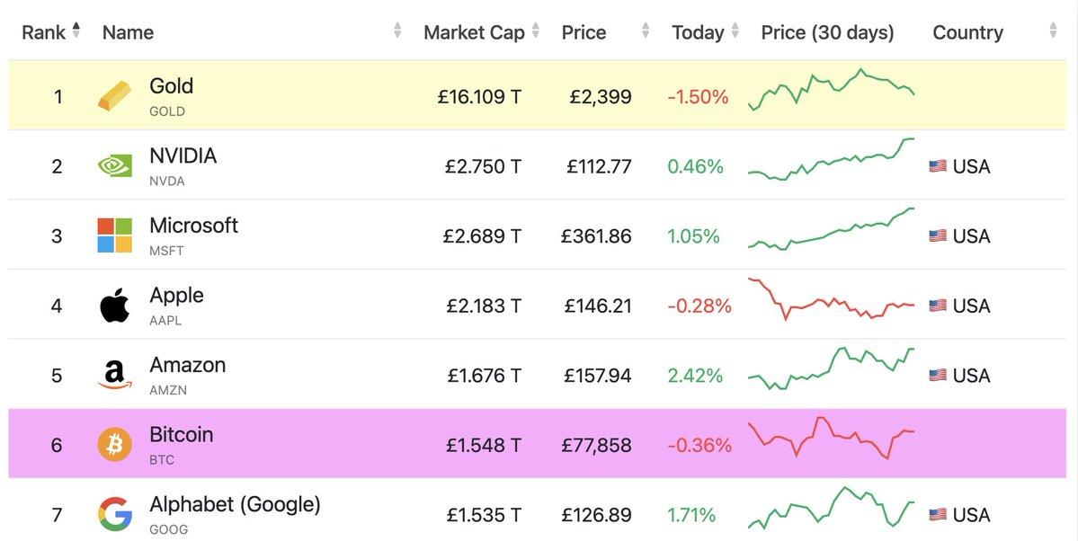به گزارش کاماپرس، ارزش بازار بیت کوین در محدوده 2.13 تریلیون دلاری قرار دارد که 30 میلیارد دلار از ارزش بازاری آلفابت یا همان مادر گوگل بیشتر است. این اتفاق در حالی رخ داد که گوگل سال‌ها نماد سلطه تکنولوژیکی جهان بود و هیچ غول فناوری دیگری نتوانسته بود از آن پیش بیفتد.
