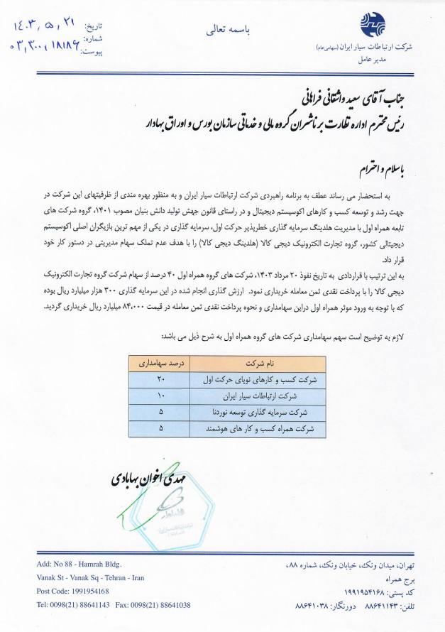 شرکت ارتباطات سیار ایران، در اطلاعیهای منتشر شده در سایت کدال، خبر از خرید 40 درصد از سهام گروه تجارت الکترونیک دیجیکالا توسط همراه اول داد.
