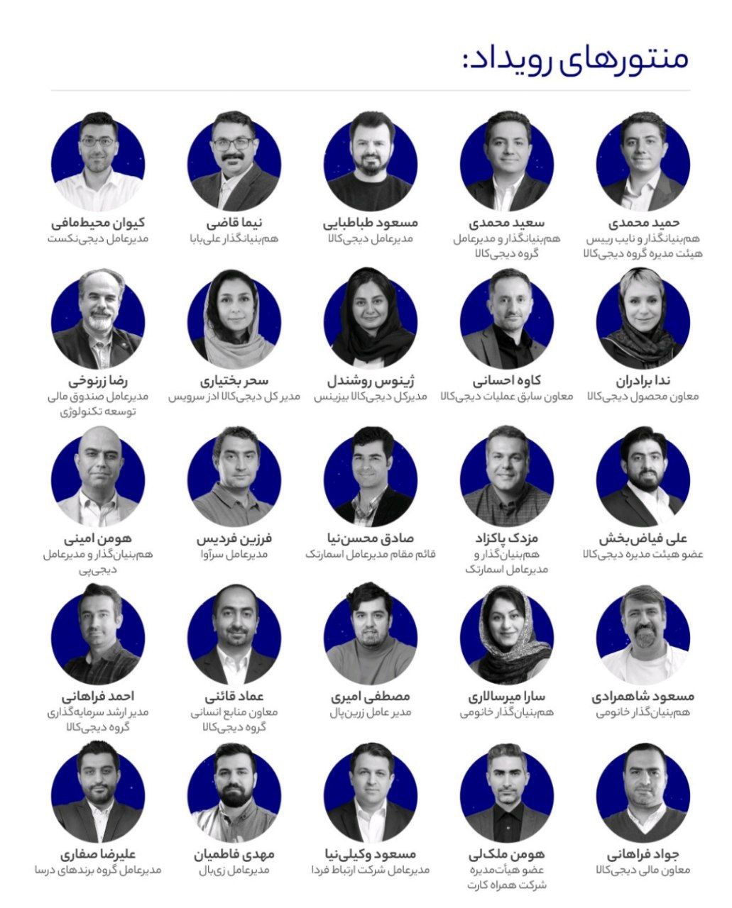 در این رویداد ۲۵ فرد موفق در اکوسیستم استارتاپی بهعنوان منتور حضور داشتند که از جمله آنها میتوان به افراد زیر اشاره کرد: