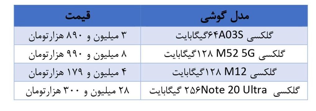 گوشیهای آ 22 با 128 گیگابایت حافظه ، اس 21 ف ای با رم 256 گیگابایت، گلکسی آ 52 با 128 گیگابایت حافظه، از دیگر پرفروشهای سامسونگ هستند که به ترتیب 5 میلیون و 350 هزارتومان ، 15 میلیون و 990 هزار تومان و 8 میلیون و 189 هزار تومان قیمت دارند.