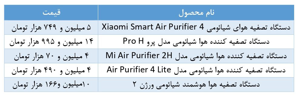 با توجه به لیست قیمت تصفیه هوا شیائومی یکی از برندهای باکیفیت و در عین حال خوش قیمت در بازار ایران محسوب میشود. این محصول در حال حاضر با قیمت حدودی 5 میلیون و 749 هزار تومان به فروش میرسد.