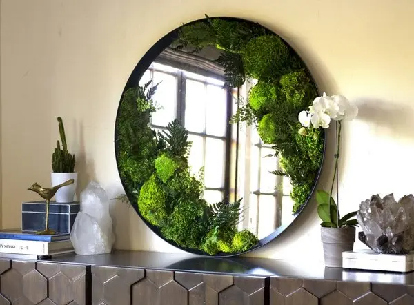 با در نظر گرفتن اینکه آینه یکی از اصلیترین و مهمترین عناصر در سالنهای زیبایی است، استفاده از قاب خزهای در اطراف آینه، یکی از مناسبترین ایدهها محسوب میشود. آرایشگران میتوانند از طیف متنوعی از خزهها در رنگهای مختلف در اطراف آینه استفاده و با ایجاد هارمونی با چوب قاب آینه، ترکیب منحصربهفردی ارائه کنند. برای اجرای این ایده باید در نظر داشت که خزهها نباید در معرض تابش نور مستقیم خورشید قرار گیرند. با اضافه کردن چراغ مناسب اطراف آینه نیز میتوان جلوه آن را دو چندان کرد.