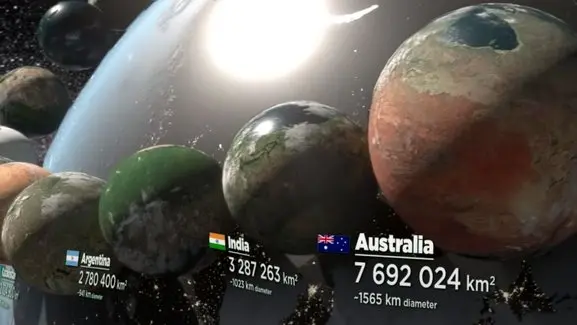 در این ویدیو که با نرم افزارهای سه بعدی طراحی شده، مساحت هر کشور به یک سیاره تبدیل شده است.