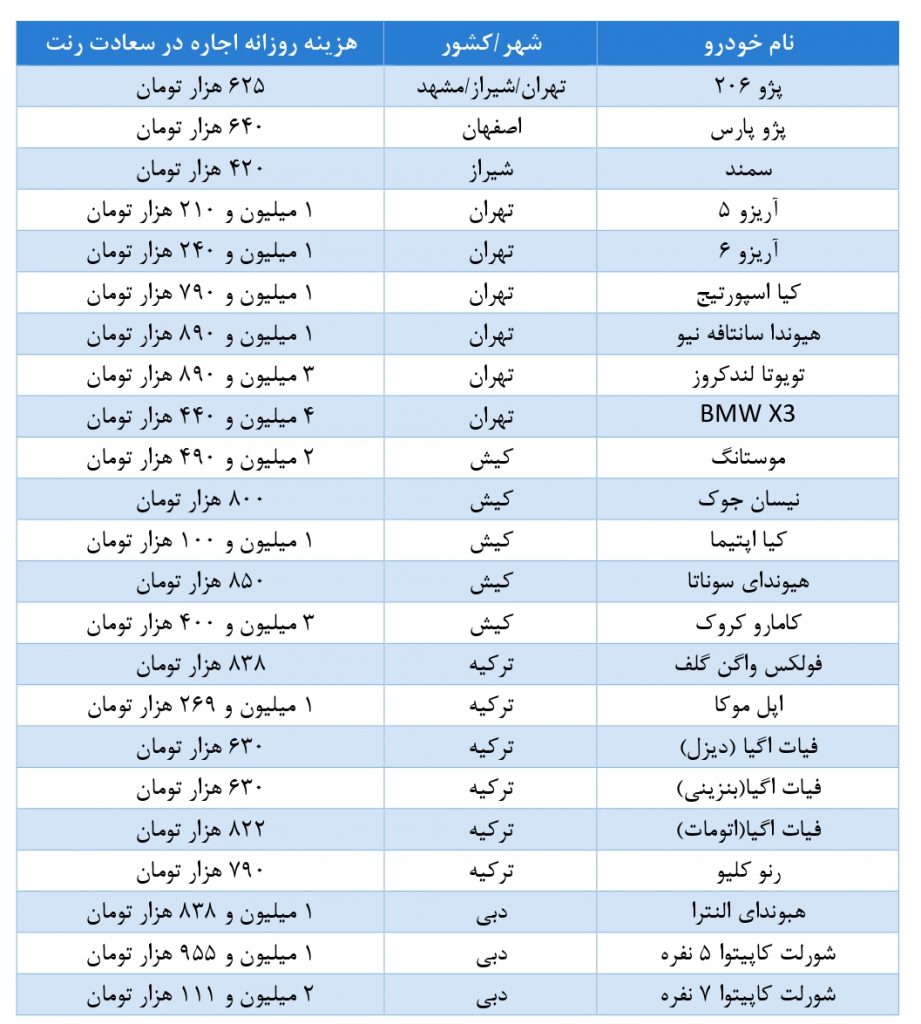 با وجود این، قیمت اجاره خودرو برای خودروهای دیگر در شهرهای مختلف، در ادامه آمده است؛