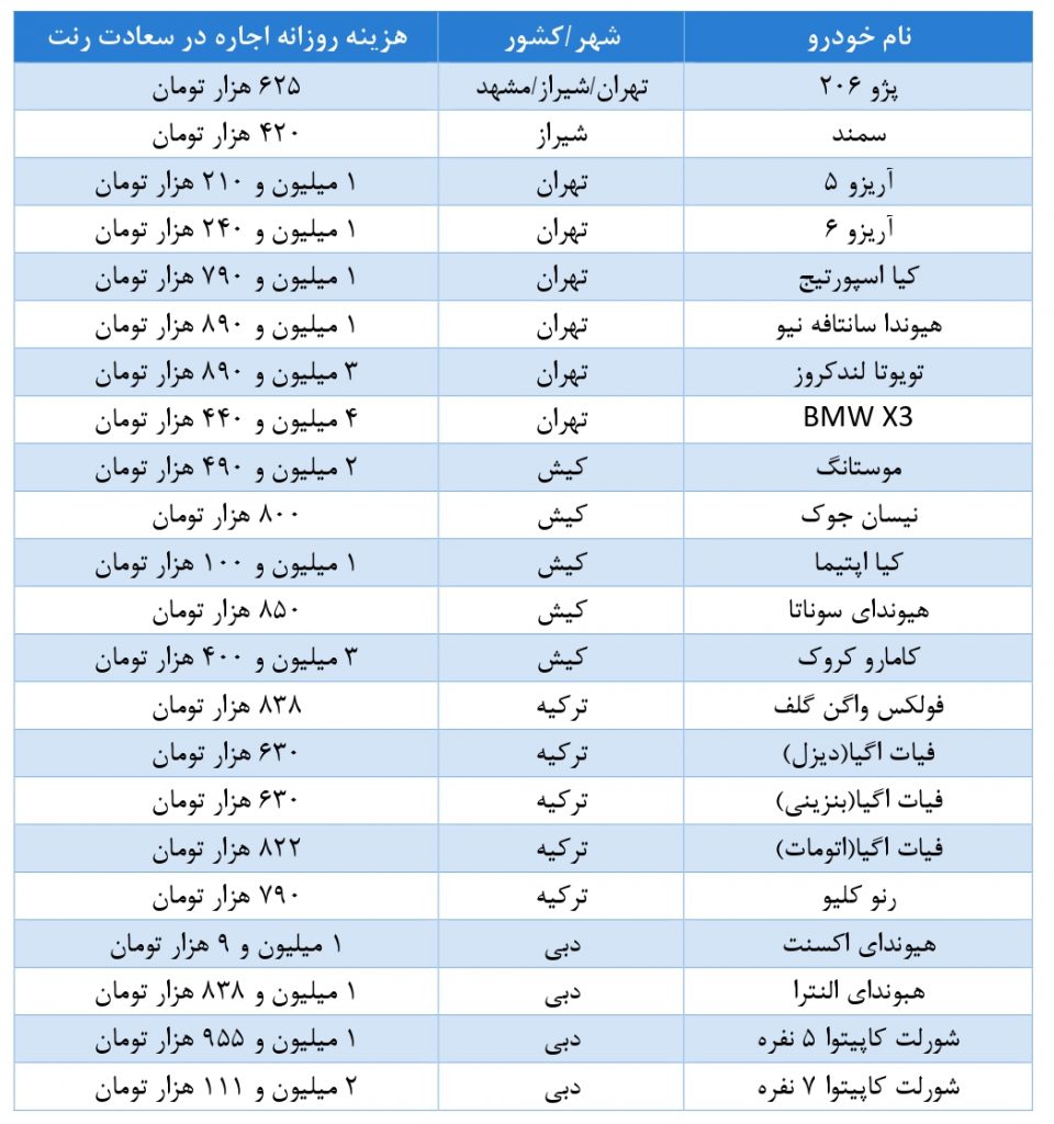 با وجود این، اگر به دنبال اجاره سایر خودروها هستید؛ قیمت اجاره خودرو برای سایر مدلها نیز در ادامه آمده است؛