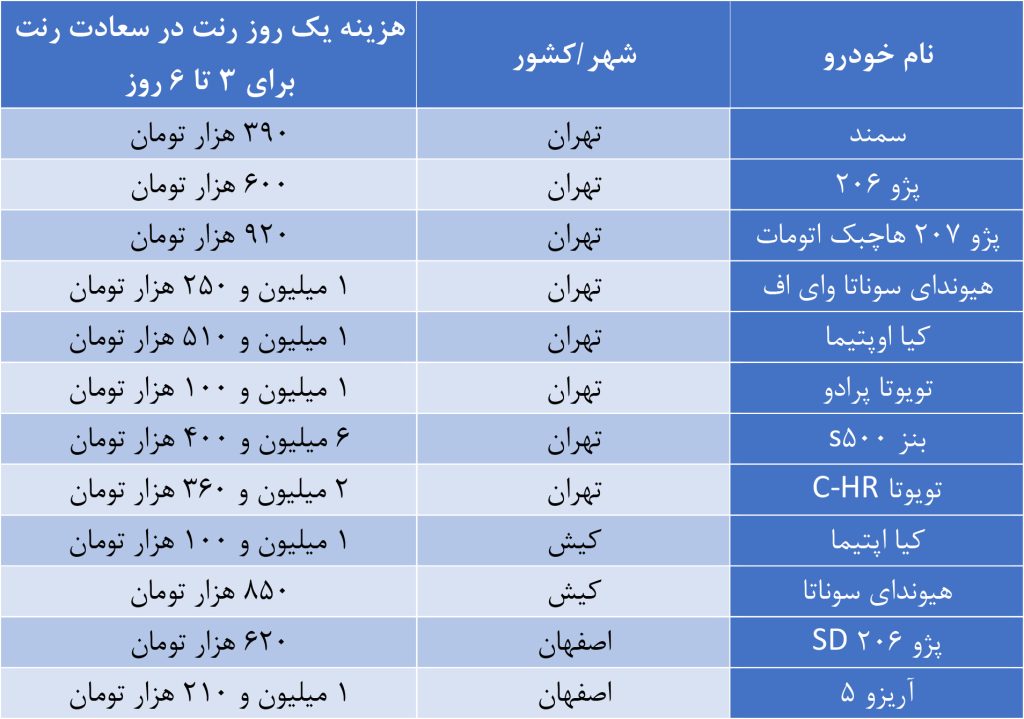 در ادامه قیمت روز اجاره خودرو های مختلف از این مجموعه قابل مشاهده است؛