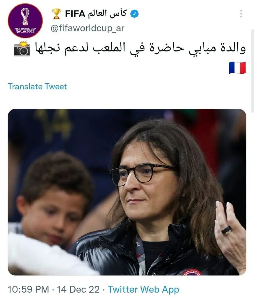 مادر کلیان امباپه از نزدیک شاهد بازی فرانسه با مراکش بود. اکانت فیفا در توئیتر با انتشار عکسی از او به این موضوع واکنش نشان داد.