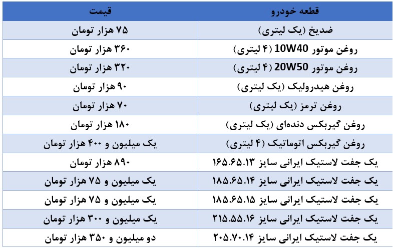 در جدول زیر، قیمت ضدیخ و برخی از لوازم یدکی خودرو قابل مشاهده است. لازم به ذکر است که قیمت‌های اعلام شده، حداقل قیمت محصولات هستند؛