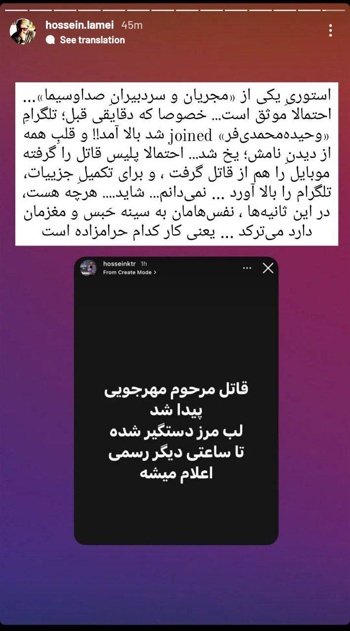 حسین لامعی، مستندساز استوری یکی از مجریان و سردبیران صدا و سیما را بازنشر کرده است که در آن خبر دستگیری قاتل داریوش مهرجویی در لب مرز به طور غیررسمی اعلام شده است.