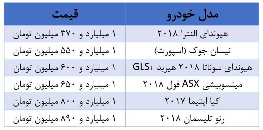 خودروهای وارداتی زیر 2 میلیارد تومان را در جدول زیر مشاهده کنید: