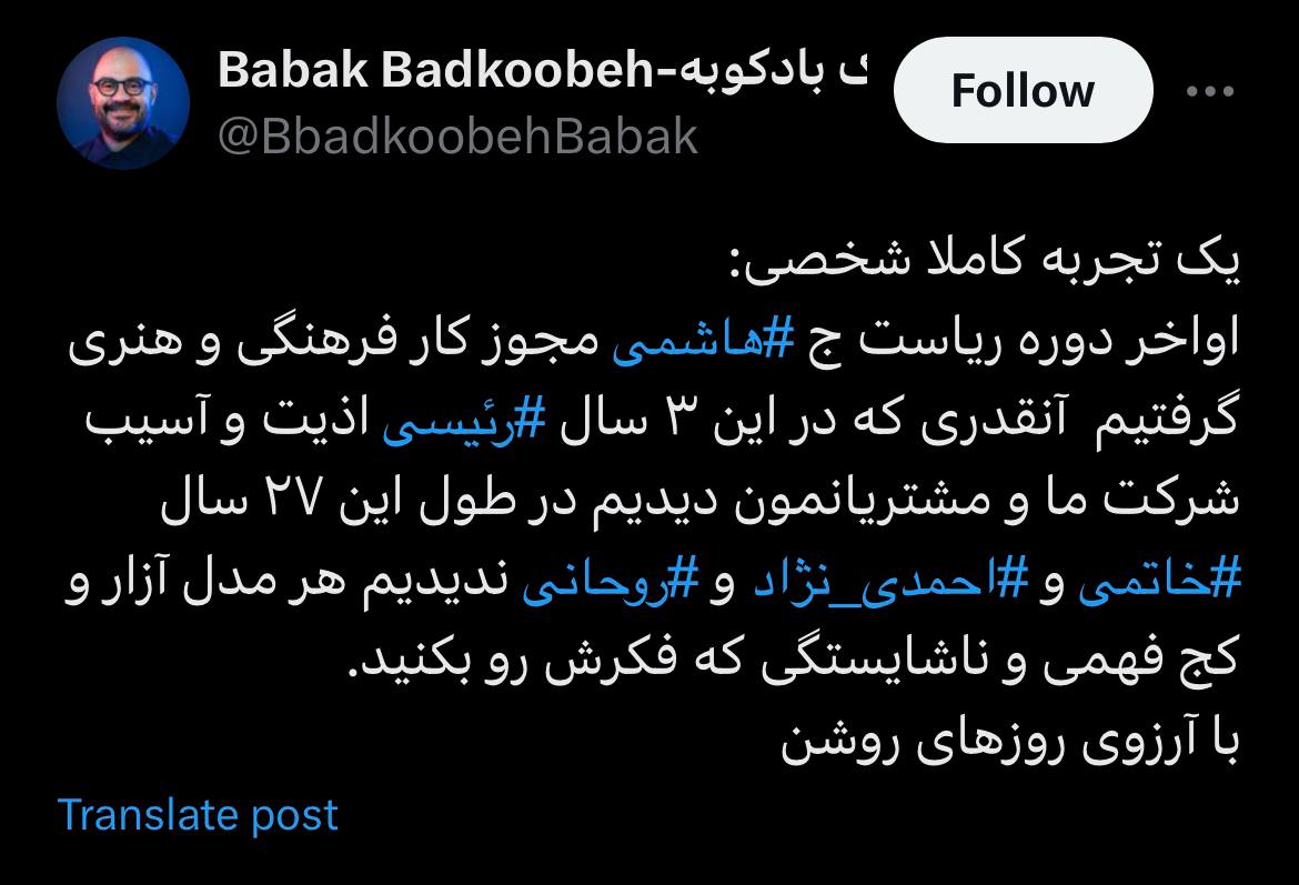 بابک بادکوبه در شبکهی اجتماعی ایکس از تجربه شخصیاش در رابطه با فعالیت فرهنگی در 5 دولت نوشت.