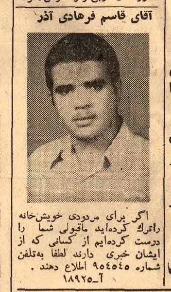 در این بریده روزنامه، تصویری از یک پسر جوان به نام قاسم فرهادی آذر مشاهده میشود که به نظر میرسد به دلیل مردودی در آزمونهای مدرسه، از خانه گریخته است.
